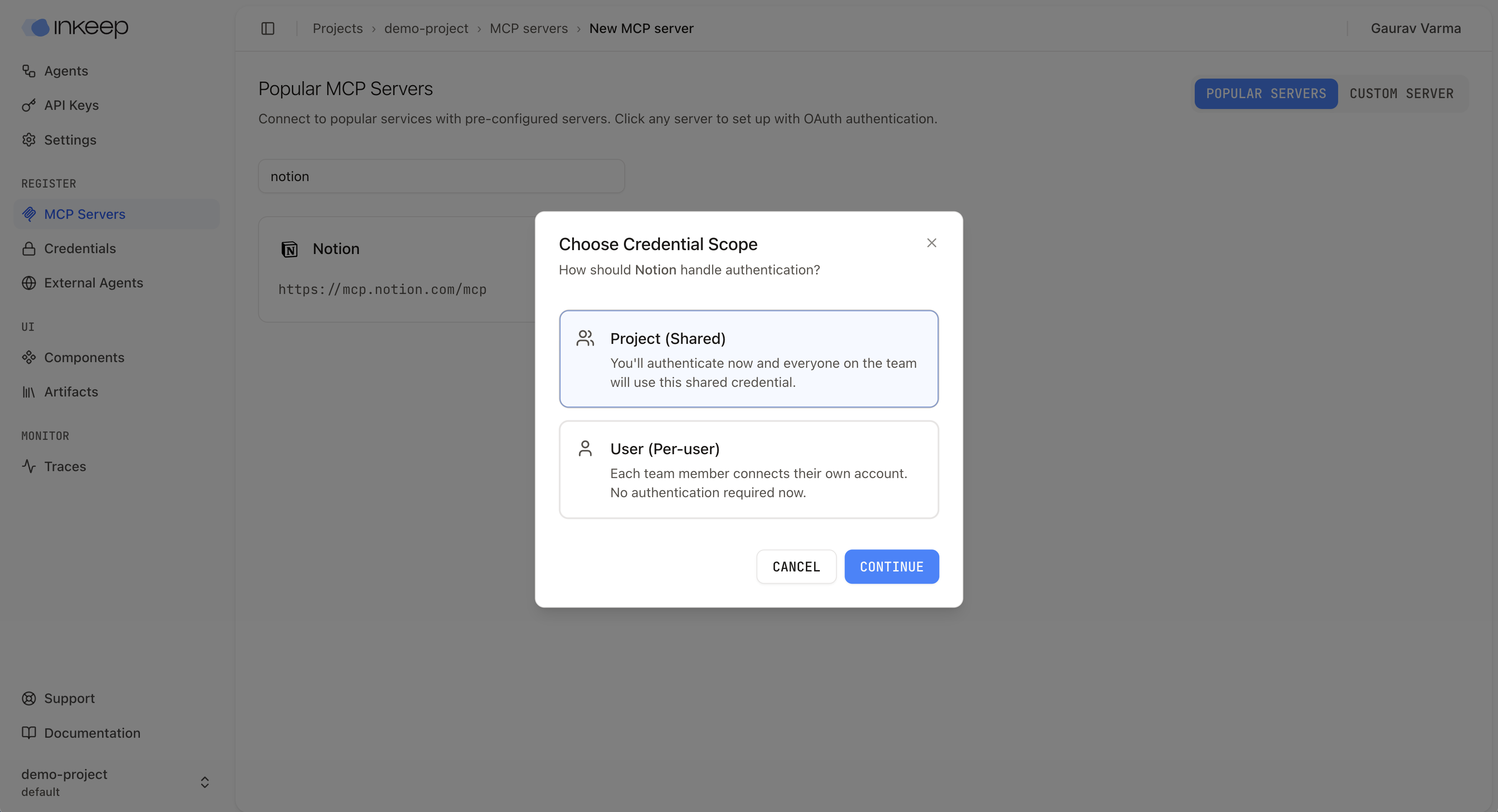 When creating a new MCP server in the Inkeep Visual Builder, you can choose to configure it at the user-level or project-level.
